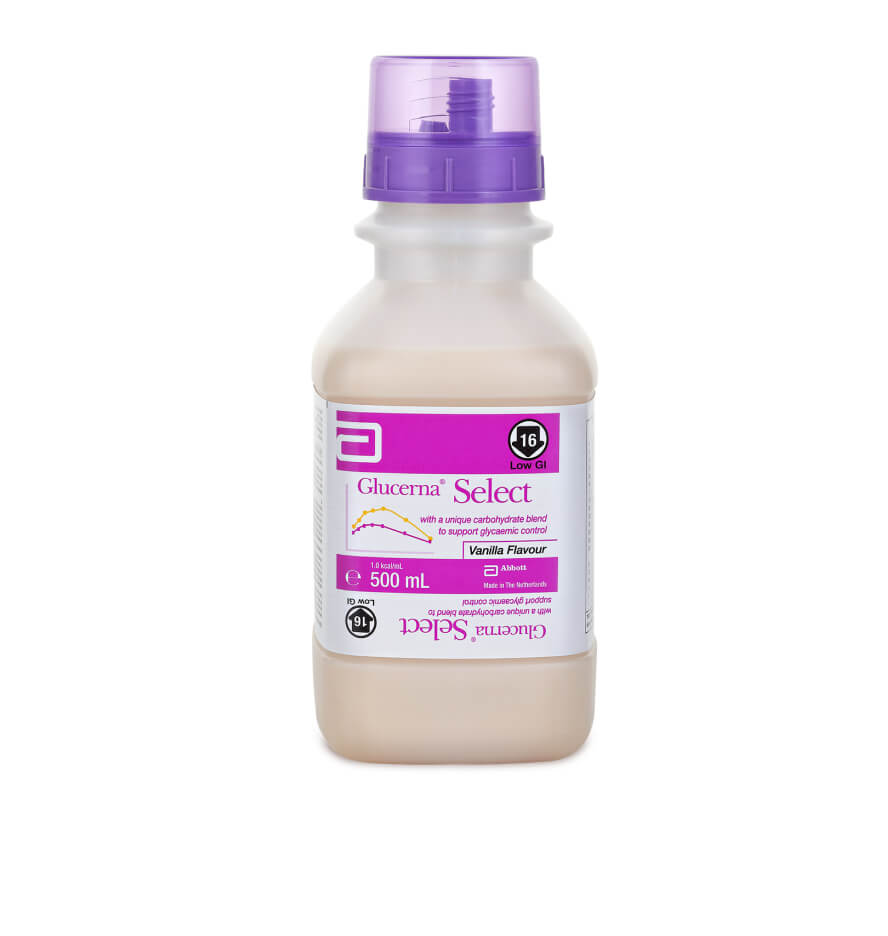 Glucerna Select is a 1.0 kcal/mL specialised high-protein tube feed with a low glycaemic index (GI=16), unique carbohydrate blend, plus fibre and FOS for the dietary management of patients with diabetes and/or impaired glucose tolerance.1