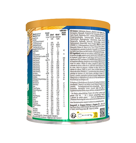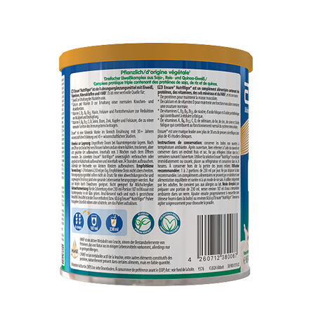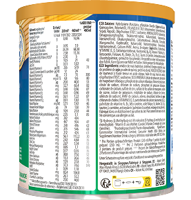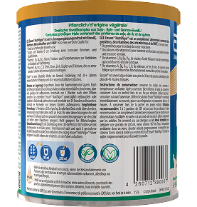 amidon de maïs hydrolysé, protéines d'origine végétale (isolat de protéines de soja, poudre de quinoa, protéines de riz), HUILES VÉGÉTALES (huile de tournesol à haute teneur en acide oléique, huile de soja, huile de canola), oligofructose (FOS)4, saccharose, SELS MINÉRAUX (citrate de potassium, phosphate de magnésium dibasique, phosphate de calcium tribasique, chlorure de potassium, citrate de sodium, chlorure de sodium, phosphate de potassium dibasique, carbonate de calcium, sulfate de zinc, sulfate de fer, sulfate de manganèse, sulfate de cuivre, iodure de potassium, molybdate de sodium, chlorure de chrome, sélénate de sodium), HMB2 de calcium, arômes, émulsifiant: lécithine de soja, chlorure de choline, VITAMINES (C, E, pantothénate de calcium, niacinamide, B6, B2, palmitate de vitamine A, B1, bêta-carotène, acide folique, K1, biotine, D3, B12), taurine, L-carnitine, antioxydants (palmitate d'ascorbyle, mélange de tocophérols). Fabriqué dans un établissement qui utilise du lait. Peut contenir des traces de lait. Ne convient pas aux allergies au lait.