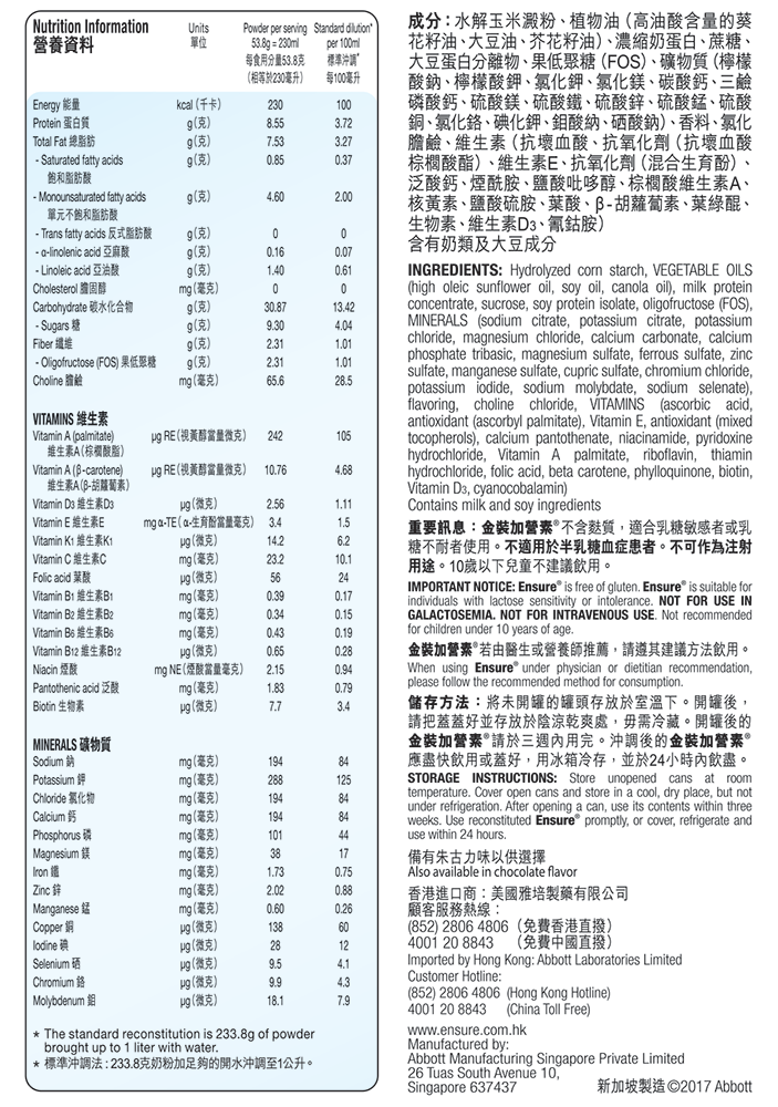 有別於一般朱古力奶,雅培Ensure®金裝加營素® 朱古力味是全面均衡營養品,能提供一餐所需均衡營養,每杯只有230卡路里,而每100毫升Ensure®金裝加營素®只有4.1克糖分,屬於低糖營養品,並適合乳糖敏感者飲用。相反,一般朱古力奶是牛奶製品,卡路里和含糖量偏高,並含有乳糖,不適合乳糖敏感者飲用。