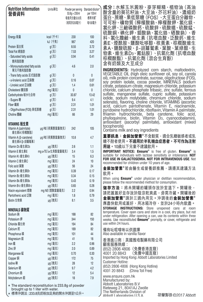 雅培Ensure®每杯只有230卡路里,而營養價值就非常完整及豐富, 適量飲用更可提供成人一餐所需的營養,可用雅培Ensure®當早餐、 午餐或晚餐。亦建議飲用期間注意每日飲食的卡路里攝取量。