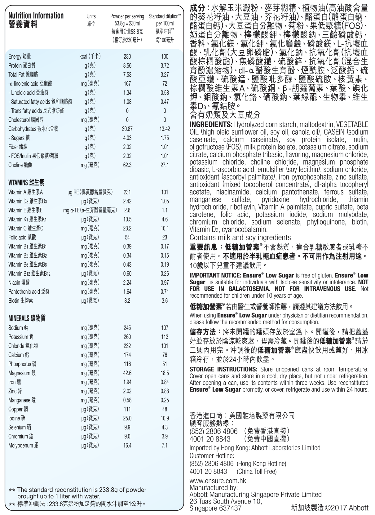 # 每100毫升雅培Ensure®低糖加營素®含1.75克糖分