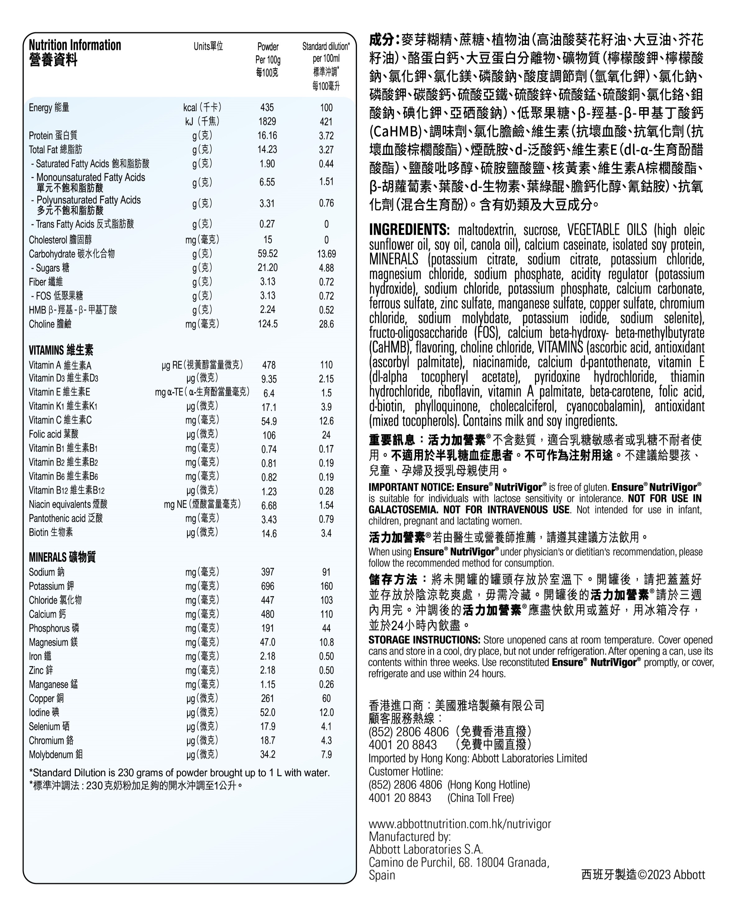 ^ 根據品牌內部數據,Ensure®Nutrivigor®活力加營素®在2013年12月於香港正式發售,為全港第一款HMB均衡營養配方(0.52克HMB/100毫升)