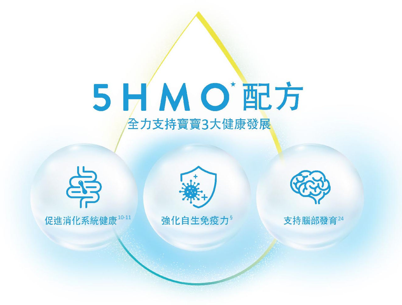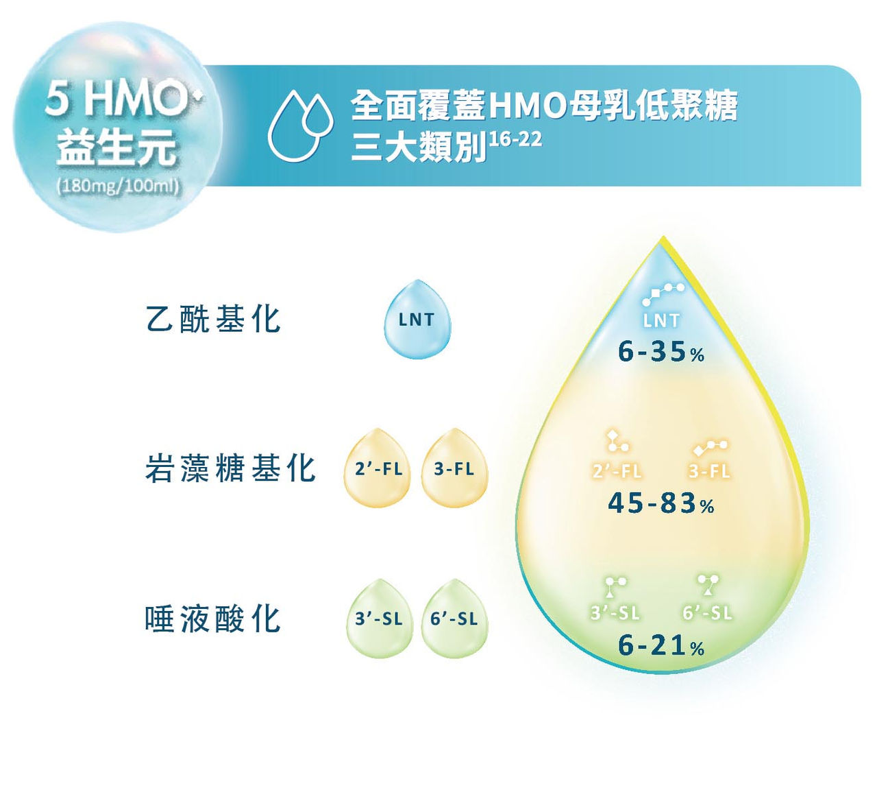 *5種母乳低聚糖HMOs組合 (2’-FL, 3-FL, 3’-SL, 6’-SL, LNT) 合共180毫克/100毫升,非源自母乳。