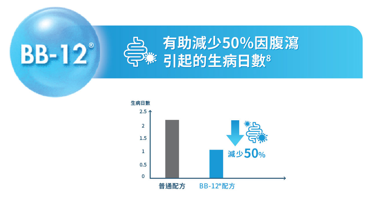 8.飲用含BB-12®配方的幼兒與對比組比較。Chouraqui JP, et al. J Pediatr Gastroenterol Nutr. 2004;38(3):288-292