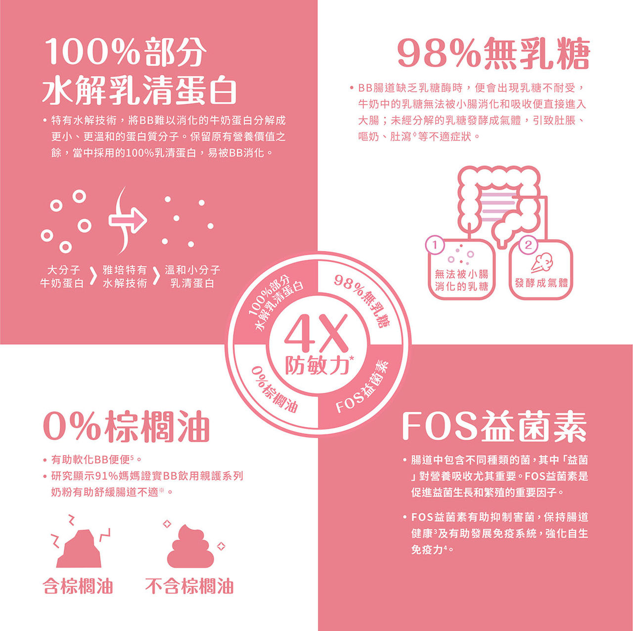 * 指100%部分水解乳清蛋白配方理論上有助減低高風險寶寶牛奶蛋白不耐受風險、98%無乳糖配方有助降低乳糖不耐受風險、 0%棕櫚油配方有助減少大便乾硬風險及益菌素有助軟化便便。