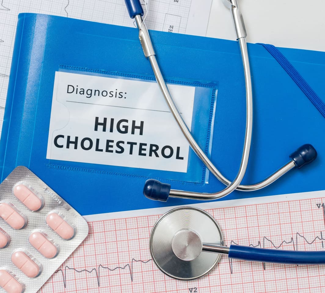 Kolesterol tinggi mengacu pada kondisi di mana jumlah kolesterol dan lemak dalam darah melebihi batas sehat. Kolesterol dan trigliserida, keduanya jenis lipid atau lemak, sangat penting untuk kesehatan sel tetapi bisa berbahaya jika menumpuk dalam darah. Penumpukan lemak pada arteri dapat menyebabkan arteri menjadi tersumbat dan meradang, atau asterosklerosis. Kondisi ini menghambat fungsi normal jantung jika arteri otot jantung terpengaruh.