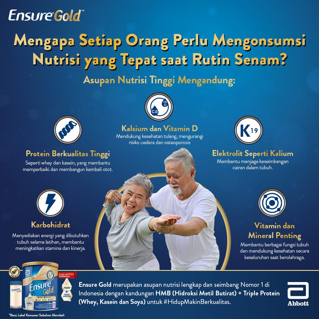 Untuk mendukung pemenuhan nutrisi harian, konsumsi Ensure Gold yang mengandung tinggi kalsium dan vitamin D, sehingga sangat baik untuk menjaga kekuatan otot dan tulang.