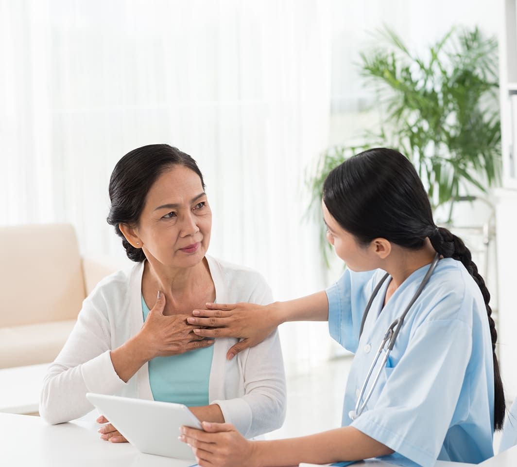 Pada penyakit jantung koroner, pembuluh darah di dekat jantung mengalami penyumbatan, sehingga memicu rasa nyeri, tekanan, rasa berat atau tidak nyaman di dada atau tubuh bagian atas, sakit leher, gangguan pencernaan, nafas tersengal-sengal, mual atau muntah, serta pusing.
