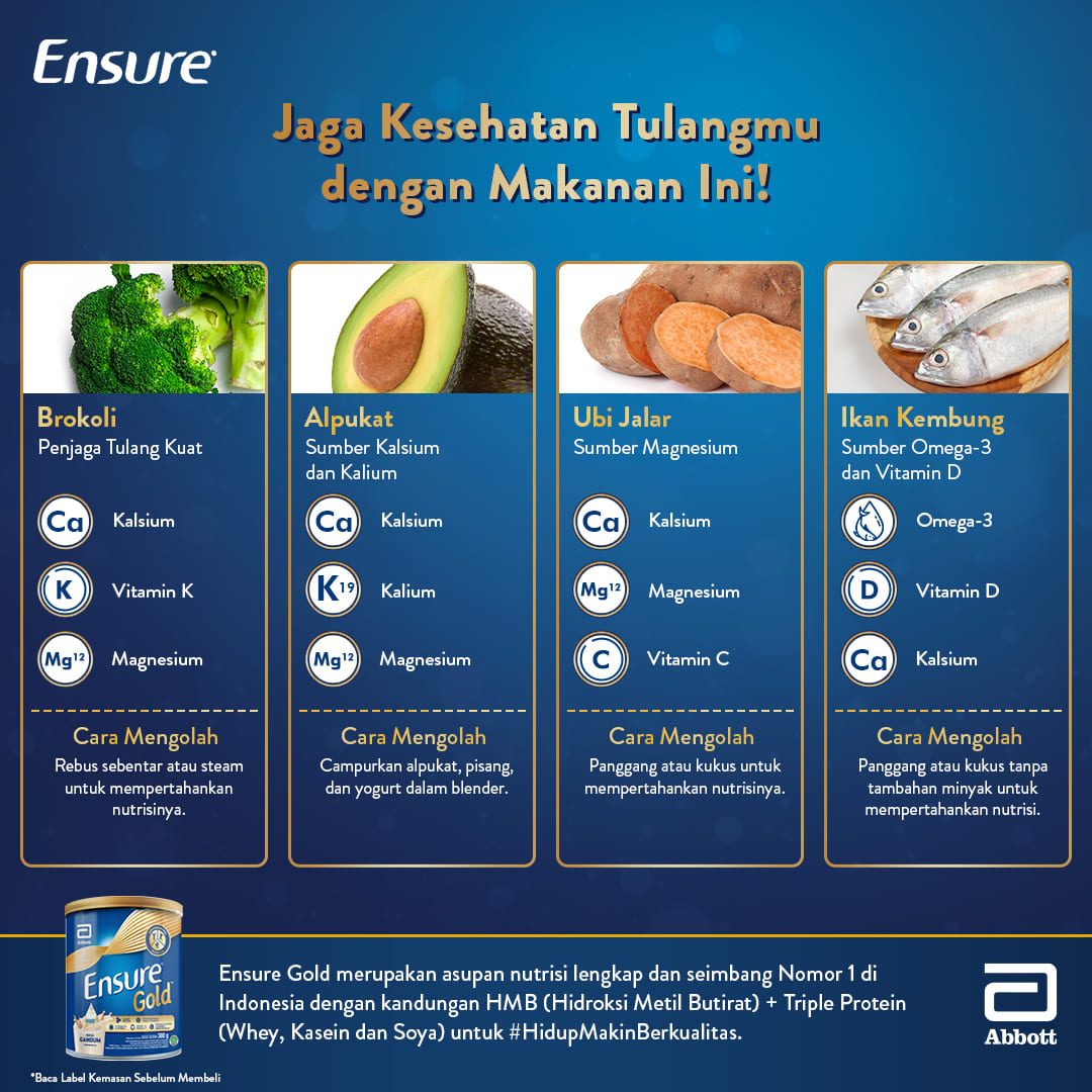 Sebagai rekomendasi suplemen atau tambahan nutrisi yang dibutuhkan tubuh untuk melawan risiko osteoporosis, Anda bisa mengonsumsi Ensure Gold. Sebagai yang pertama dan satu-satunya di Indonesia yang mengandung formula HMB (Hydroxy Methyl Butyrate) dan Triple Protein (Whey, Casein, dan Soy), Ensure Gold juga diperkaya dengan 13 vitamin dan 9 mineral, serta kaya akan vitamin D dan kalsium, komponen penting untuk kekuatan tulang.