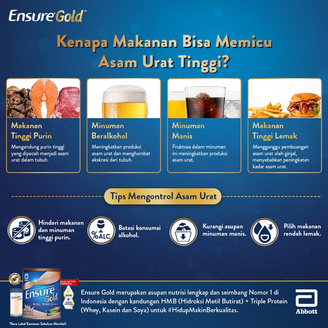 Selama menghindari makanan tinggi purin, Anda bisa mengkombinasikannya dengan konsumsi Ensure Gold agar asupan nutrisi Anda terjaga. Ensure Gold hadir sebagai solusi nutrisi lengkap dan seimbang bagi Anda yang ingin menjaga kesehatan dan stamina di usia dewasa. Tak hanya mengandung nutrisi lengkap.Ensure Gold juga satu-satunya susu yang mengandung HMB dan triple Protein (Whey, Kasein, dan Soya) untuk menjaga kekuatan tulang dan otot, sekaligus daya tahan tubuh.