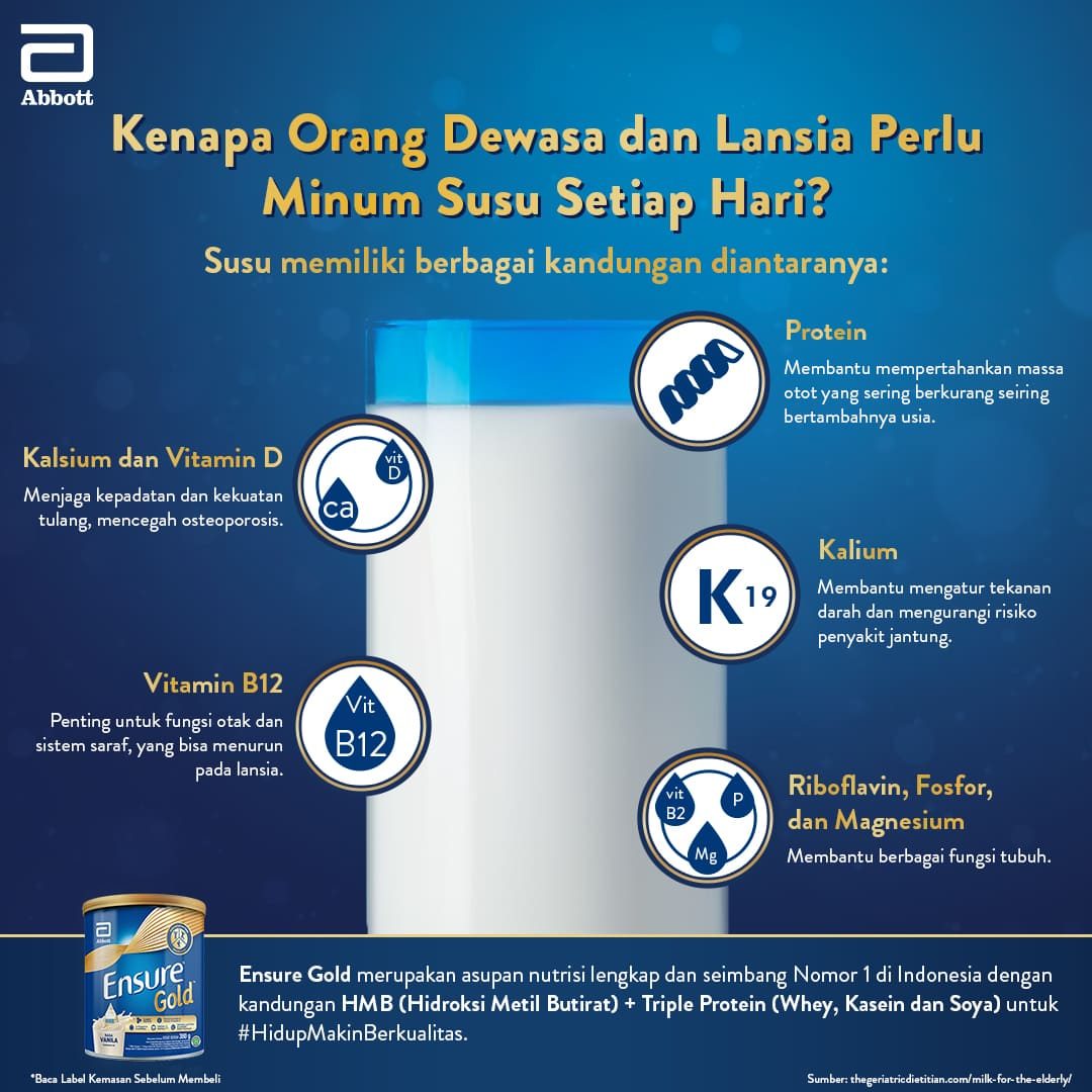 Ensure Gold merupakan brand nomor 1 di Indonesia ini telah teruji klinis mengandung HMB (Hidroksi Metil Butirat) dan Triple Protein (Whey, Kasein, dan Soya). Selain itu, Ensure Gold juga diformulasikan dengan kandungan Omega 3, Omega 6, Vitamin D, Vitamin C, Zinc, Selenium, dan Kalsium yang batu jaga fungsi jantung tetap optimal.