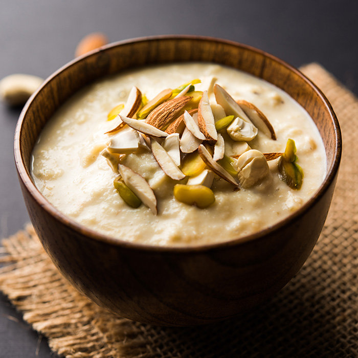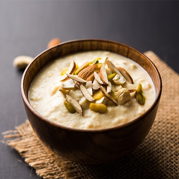 Serve the chilled basundi garnished with almonds and pistachios.