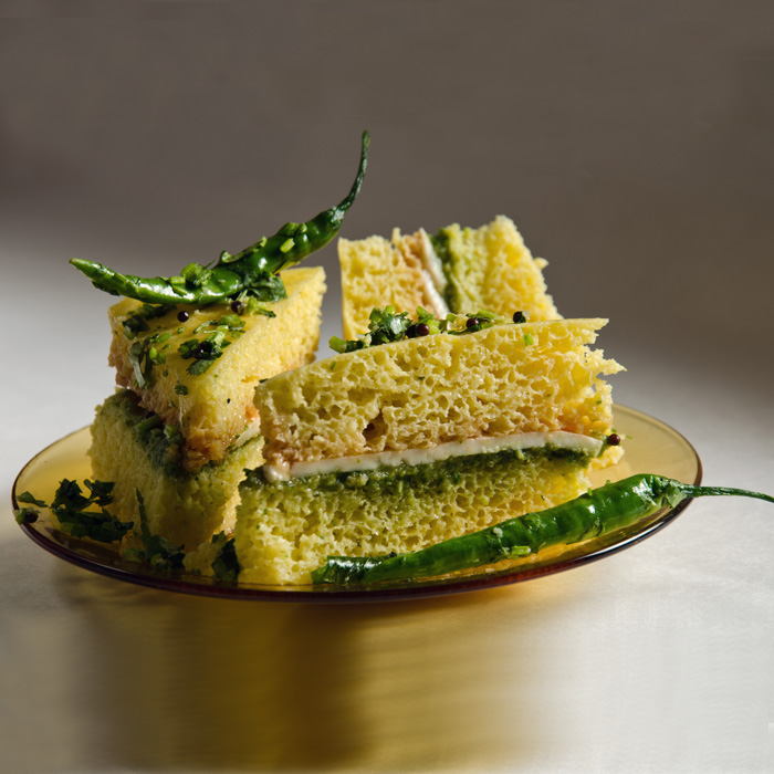 Cut the assembled dhokla into small squares and serve with the remaining chutney on the side.