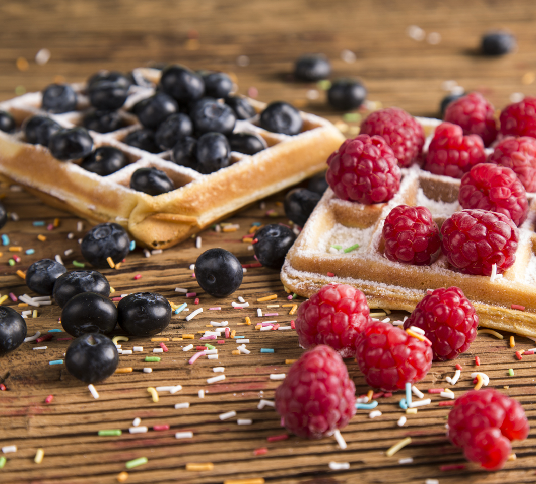 Waffles covered in a chocolate cream made with PediaSure® chocolate, served with raspberry jam and fresh raspberries.