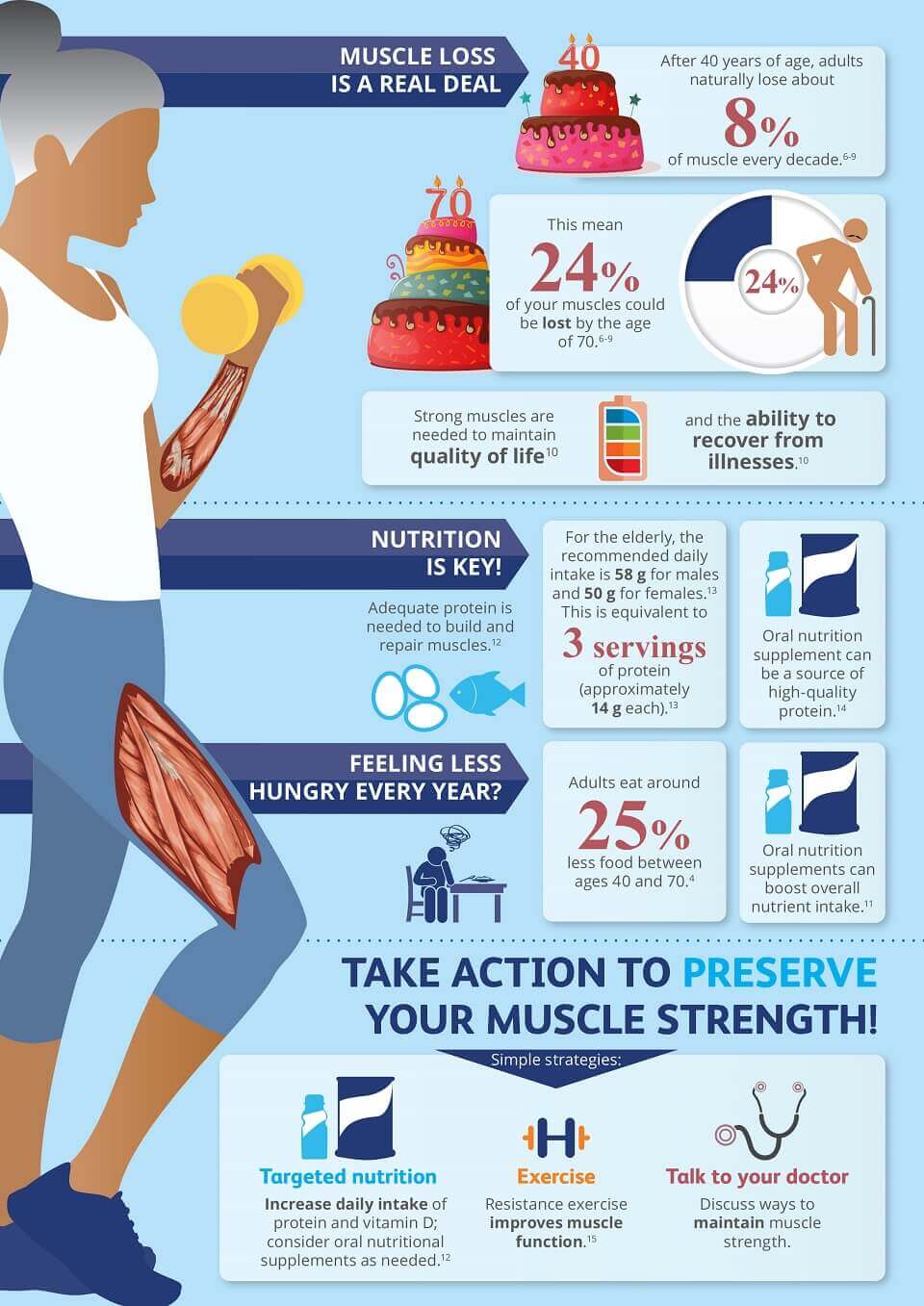 Nutrients such as iron, calcium, magnesium and vitamin D are necessary to maintain normal muscle function.3 However, many eat less as they age.4 Without a well-balanced diet, it is hard to obtain all the necessary vitamins and minerals for optimum health.5