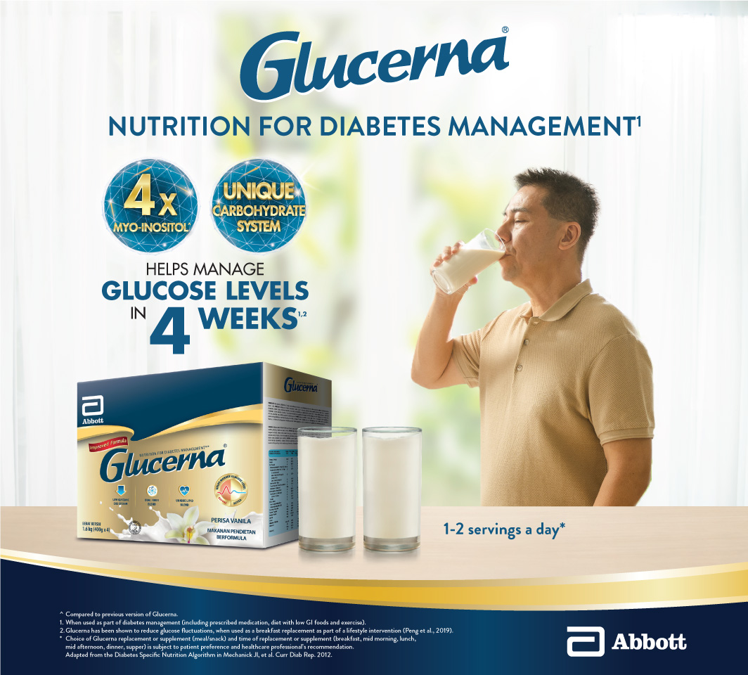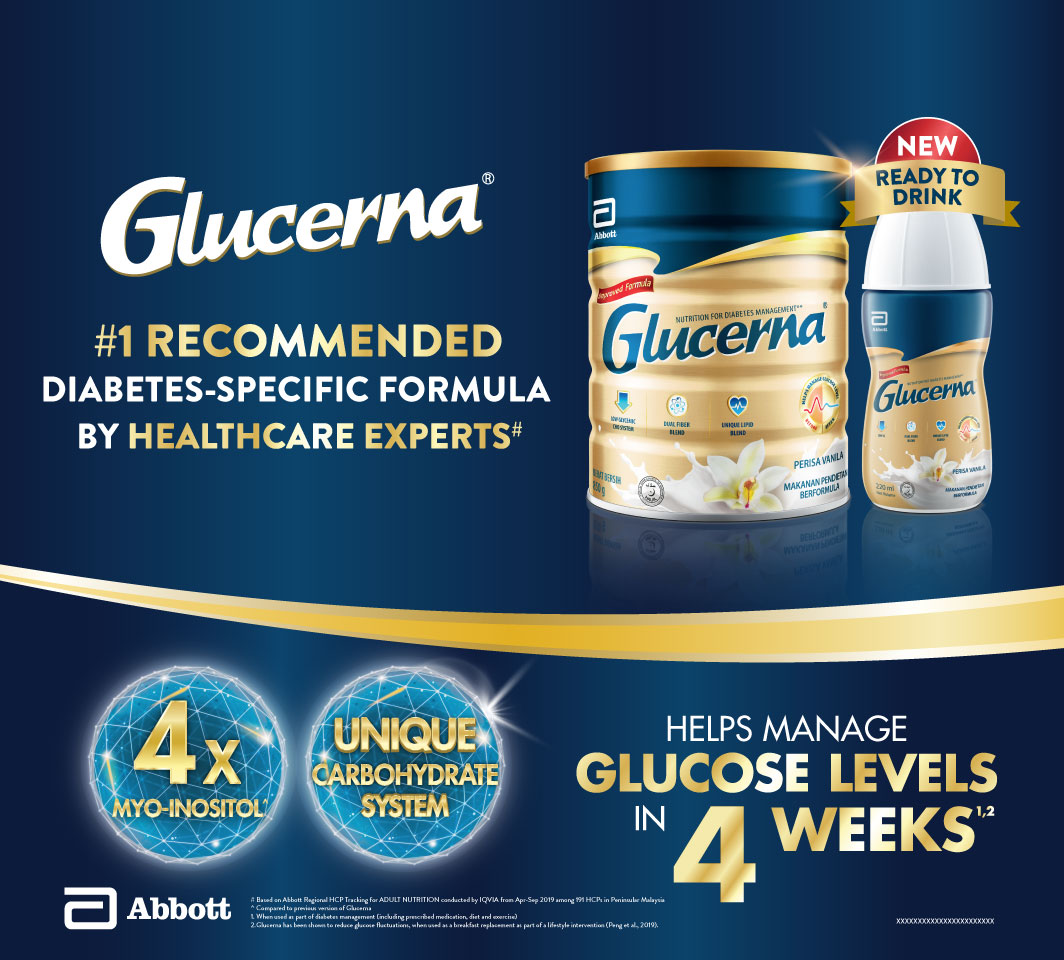GLUCERNA® is #1 recommended diabetes specific formula by healthcare experts#, scientifically proven to reduce HbA1c levels when used as part of structured lifestyle intervention1.