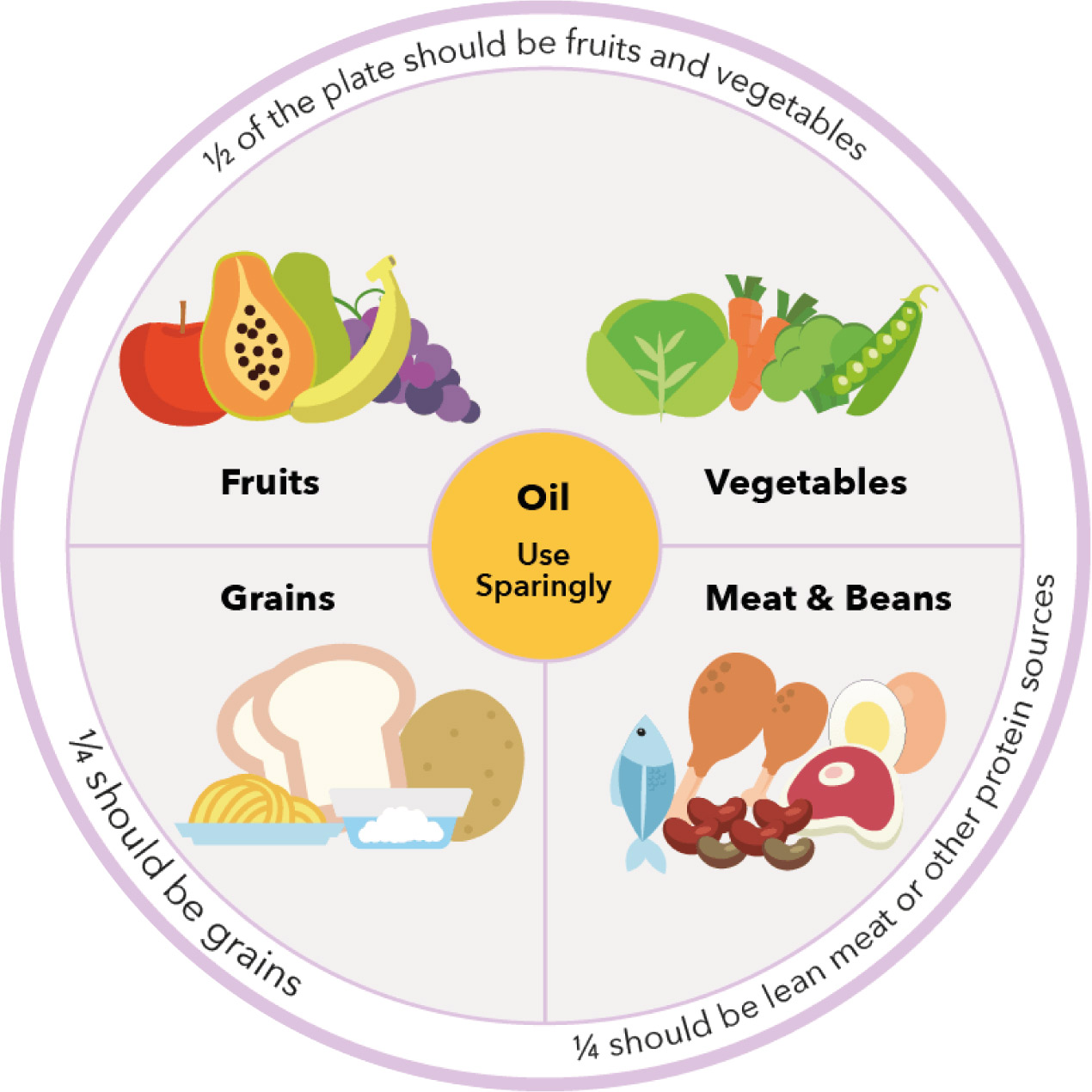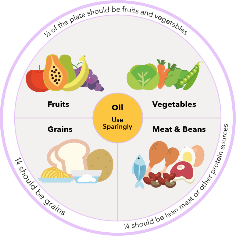Using the Malaysian Healthy Plate and adopt the quarter-quarter half principle for balanced meals1.