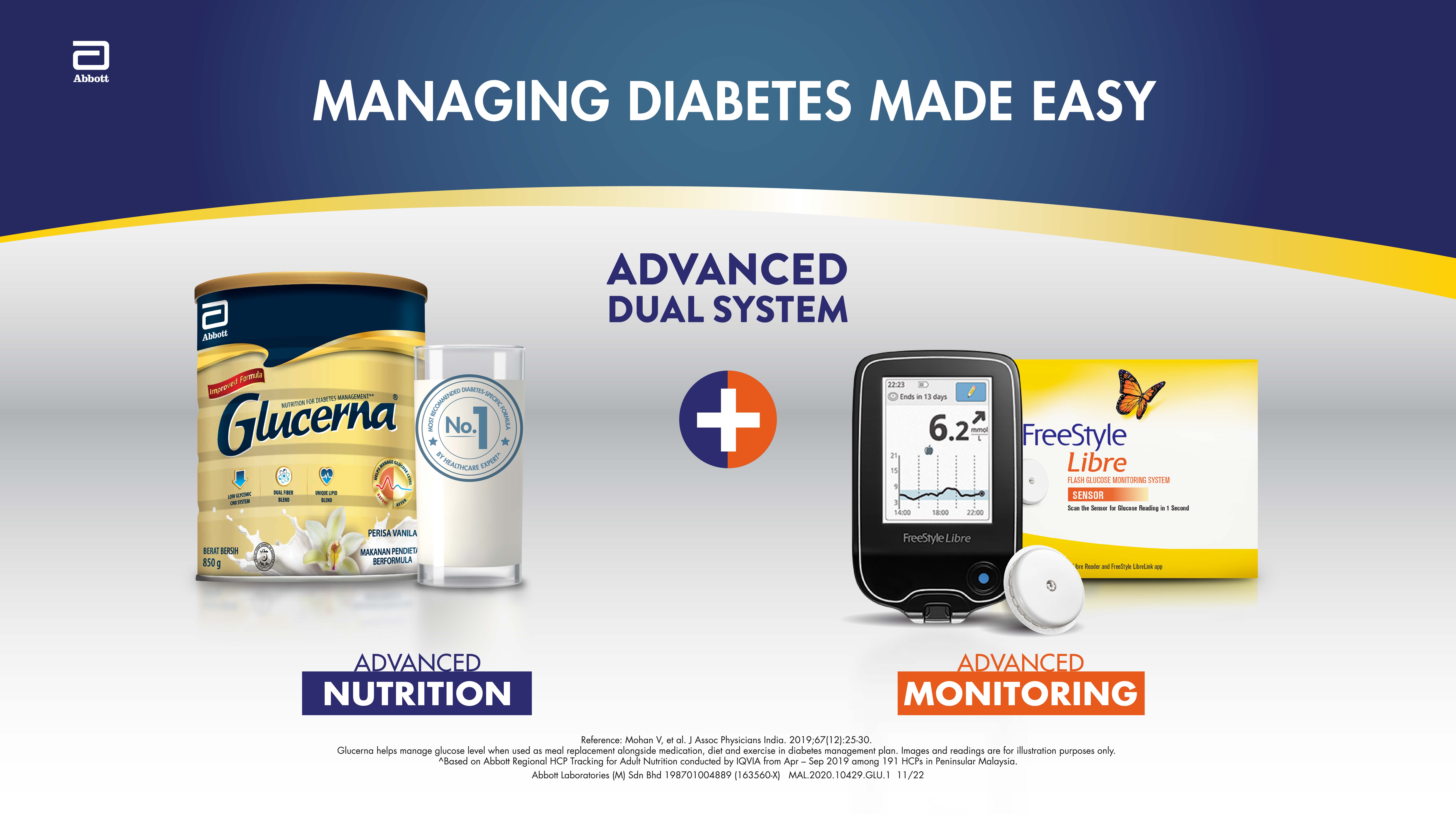 Managing diabetes can be challenging. Every one of your diet and lifestyle choices matter to help you stay in control. Be in control today with Abbott’s Advanced Dual System, incorporate Glucerna®, a diabetes-specific formula into your daily meal plan and get feedback on how your diet and exercise choices would affect your glucose with FreeStyle Libre. Start right today to manage and monitor diabetes with ease and confidence!