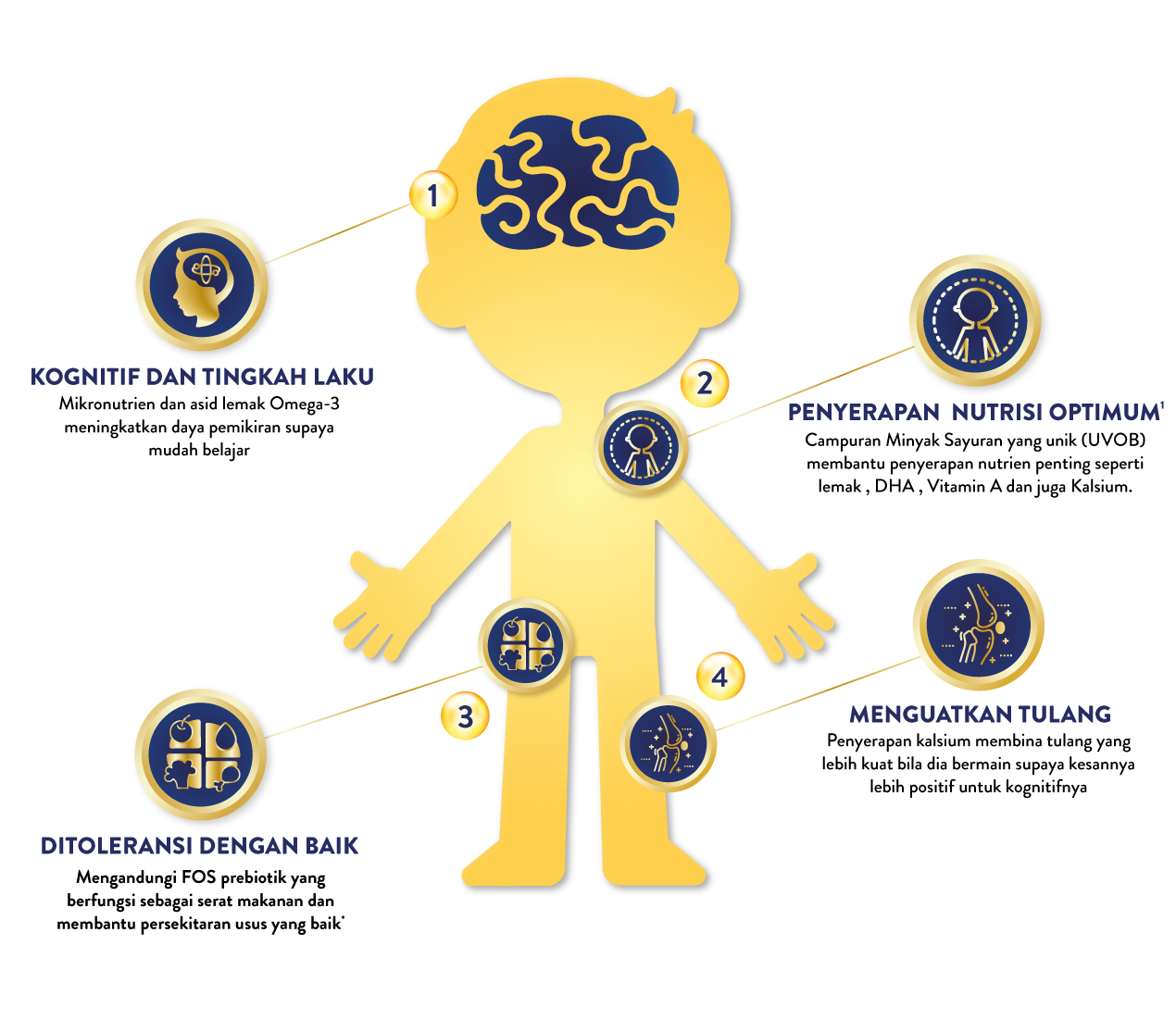 *Penyerapan nutrien yang optimum merujuk kepada penyerapan lemak, DHA, kalsium dan sebagainya, berbanding dengan formula lain tanpa campuran minyak sayuran yang unik. Rujukan: Nelson et al. (1998), Leite et al. (2013) & de Souza et al. (2017)