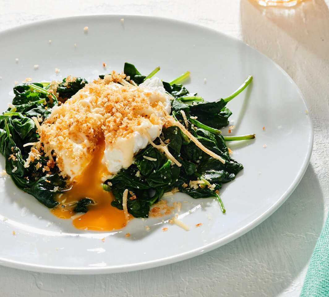 Spoon mixture over eggs and spinach. Sprinkle with combined parmesan cheese and breadcrumbs.