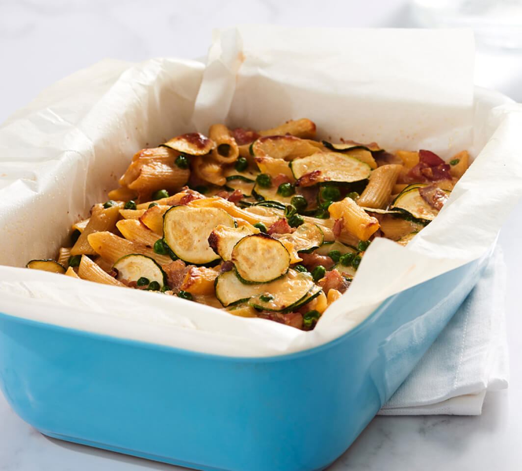 Place zucchini, peas and pasta in a large bowl. Add sauce and eggs. Mix well.