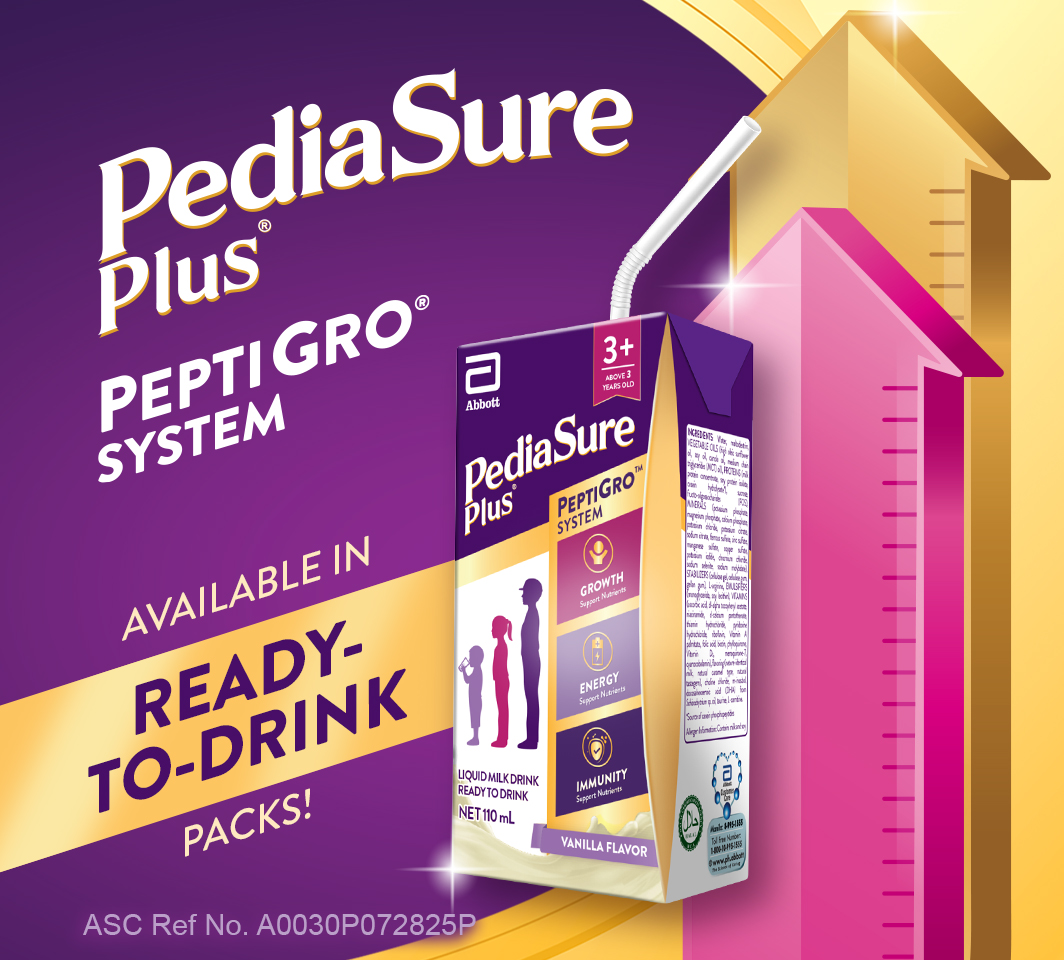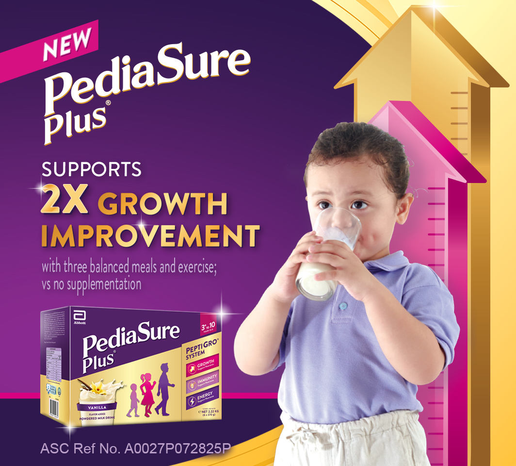 Drinking two glasses of PediaSure Plus® everyday helps to provide for a child’s growth and development. With the NEW PeptiGro® System which is a combination of Natural Vitamin K2, Arginine and Casein Phosphopeptides (CPPs), to support 2x Growth Improvement, with three balanced meals and exercise; vs no supplementation