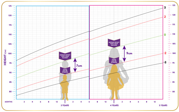 Let’s look at this chart, where we compare the height of a normal 3-year-old girl and boy versus a stunted 3-year-old boy and girl. Do you observe the height difference in the two sets of children?5,6