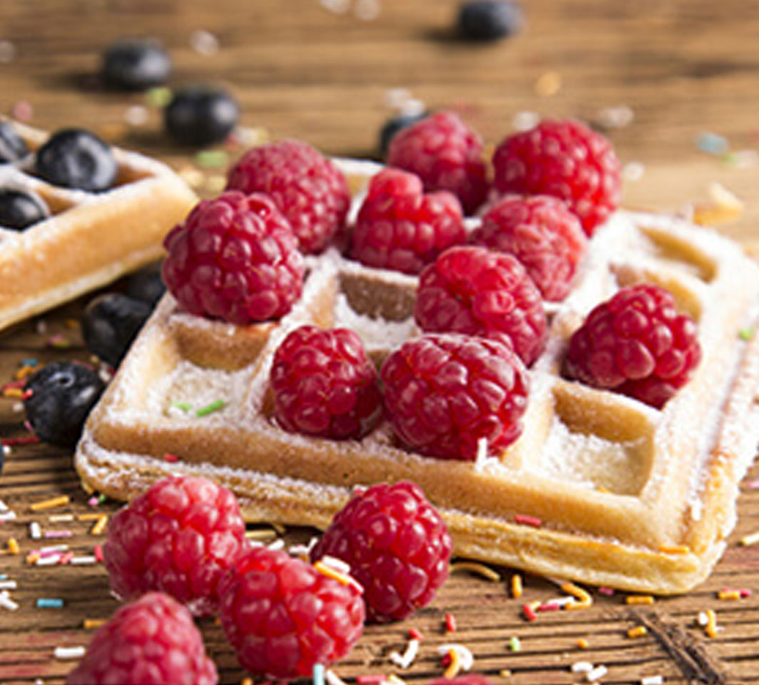 • Coat one side of the waffles with the chocolate mixture, serve with raspberry jam and fresh raspberries.