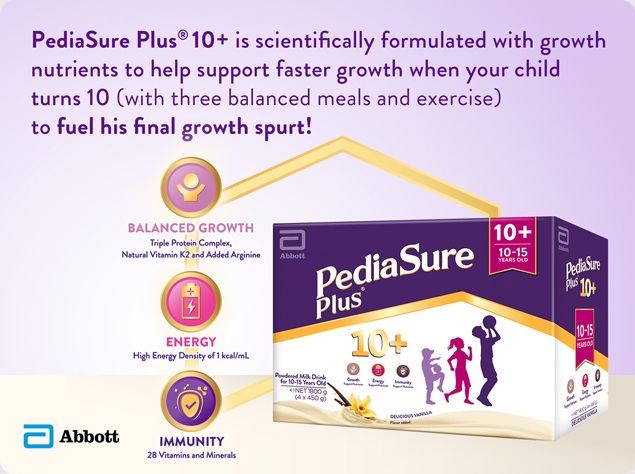 When your child turns 10, PediaSure Plus® 10+ can support his nutritional needs and active lifestyle. This scientifically formulated drink provides essential growth nutrients, including natural Vitamin K2 and arginine, to help fuel his final growth spurt. Give him two glasses daily, along with three balanced meals, or as a snack between daily activities to fuel his final growth spurt.