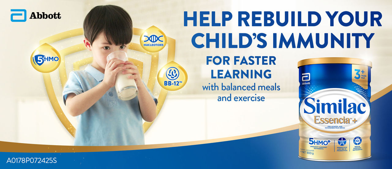 NEW Similac Essencia®+ is a powdered milk formula for School-Age kids, 3 years old and above. It is enriched with prebiotics (oligosaccharides) in the form of 5HMO blend, BB-12 Probiotics, nucleotides and 26 vitamins and minerals.