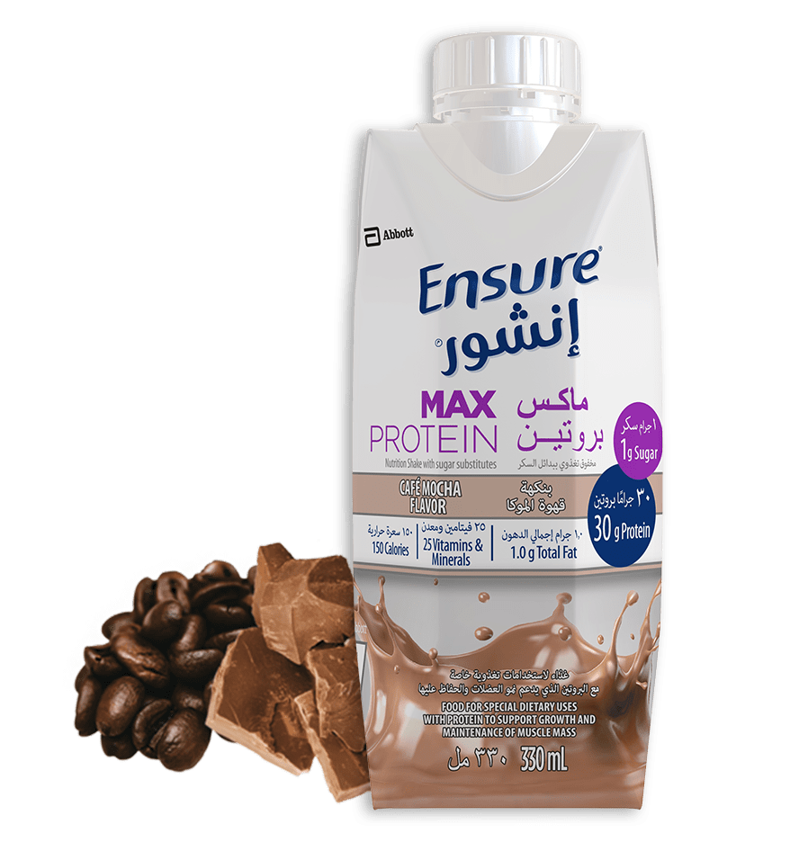 Ensure® Max Protein offers 30 grams of high-quality protein to support muscle health and satisfy hunger. Each shake contains 1 gram of sugar, 25 essential vitamins and minerals, 4 grams of fiber with prebiotics, and 100 milligrams of caffeine (as much as a cup of coffee *) to boost energy. With only 150 calories, it provides targeted nutrition for those needing extra protein.