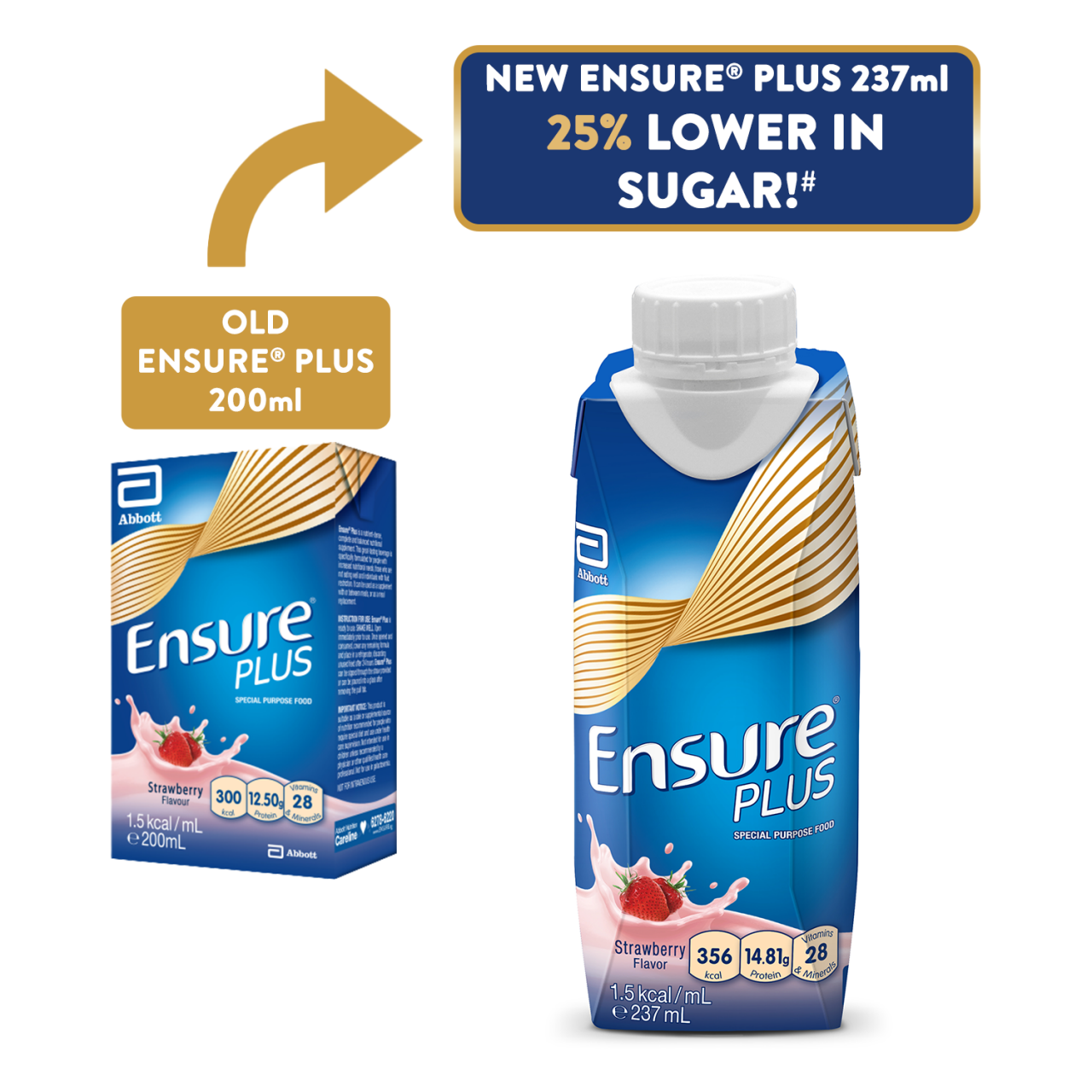 Same Energy Dense, Complete & Balanced Nutrition in Brand New Packaging!New Ensure® Plus comes in an improved formula that is 25% lower sugar# while continuing to deliver nutrient-dense complete and balanced nutrition. This great tasting beverage is a source of protein and is lactose and gluten-free.