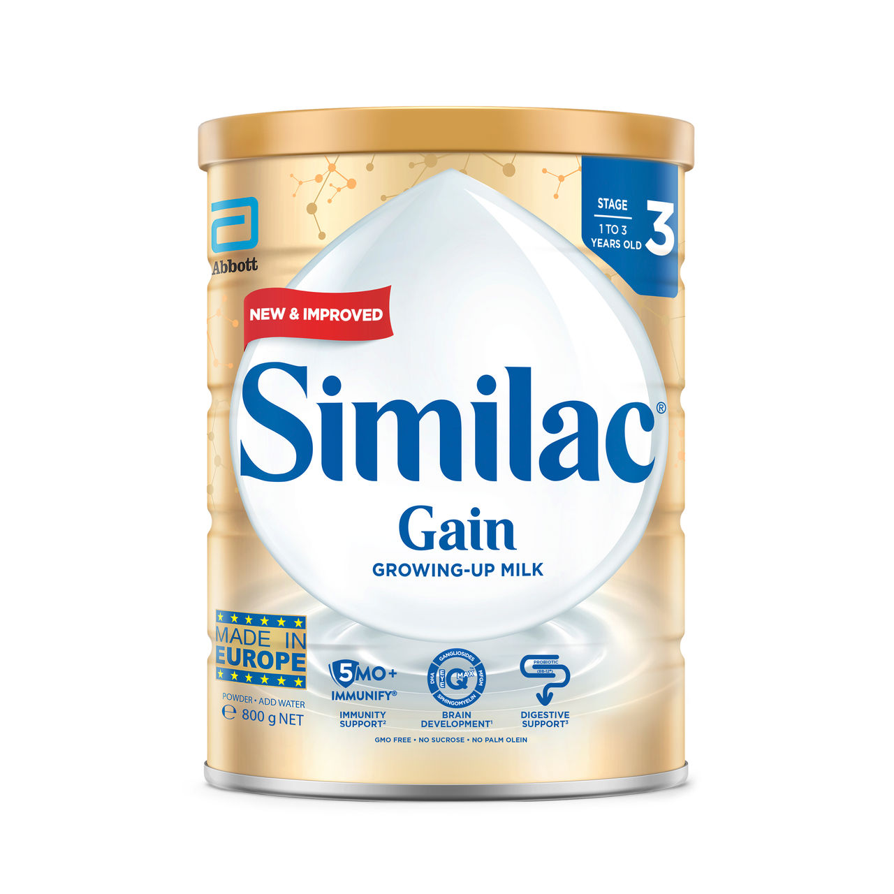 NEW Similac® Gain, now formulated with the EyeQMax Nutrition System, is enhanced with MFGM and sphingomyelin to support mental and cognitive function2. It features a unique blend of 5‑MOs with IMMUNIFY® Ingredients* to help support immunity. Similac® Gain contains no sucrose, no palm oil, and is GMO‑free.