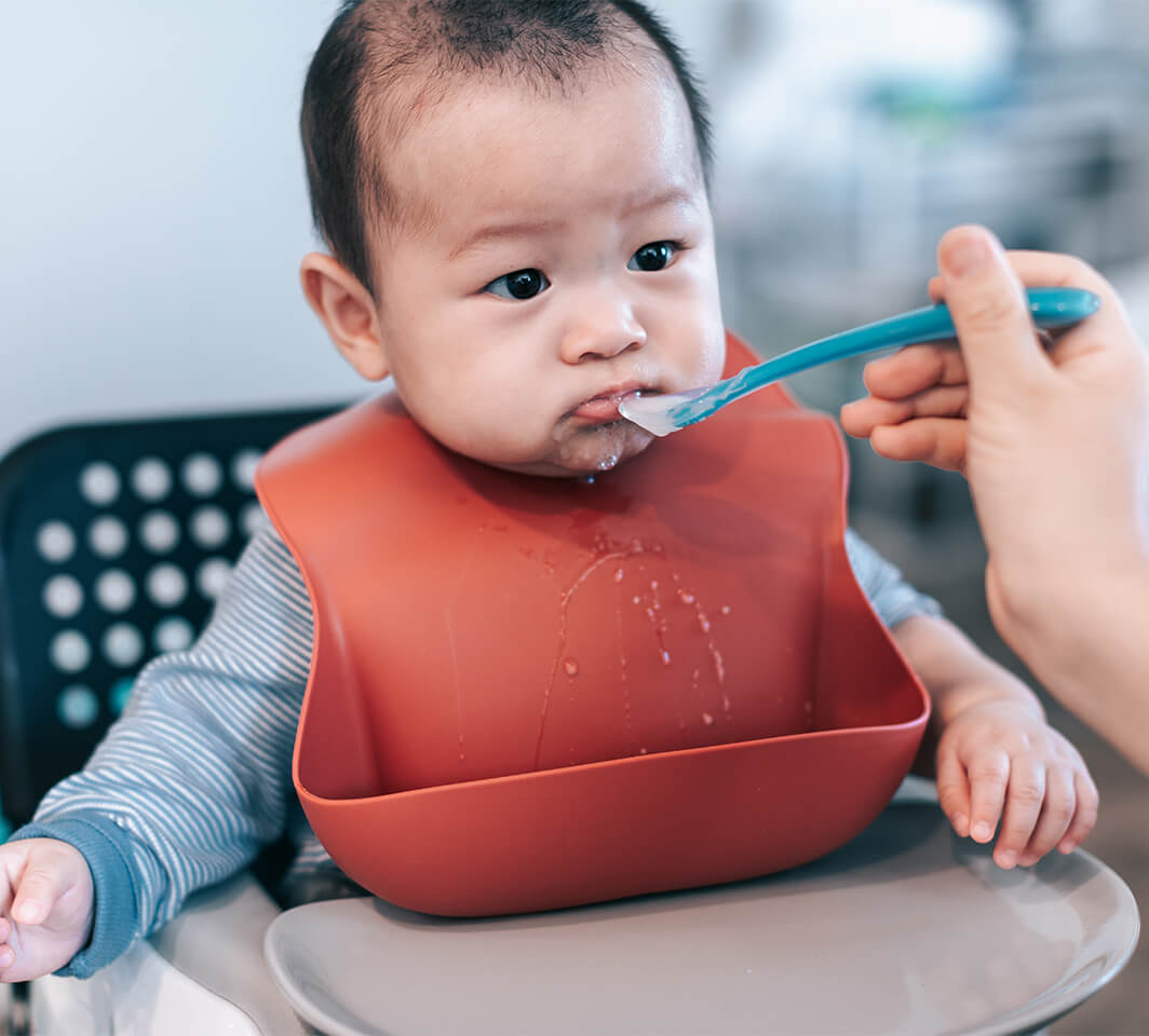 Once you get to potentially allergenic foods (eggs, dairy, nuts, wheat, or fish), give your baby only tiny amounts.5Observe your baby for adverse or allergic reactions, which often manifest as a rash, eczema, swelling of the skin, diarrhoea, or vomiting.5-6 Given no signs of allergy, you can start to include these foods to your baby’s regular diet.5