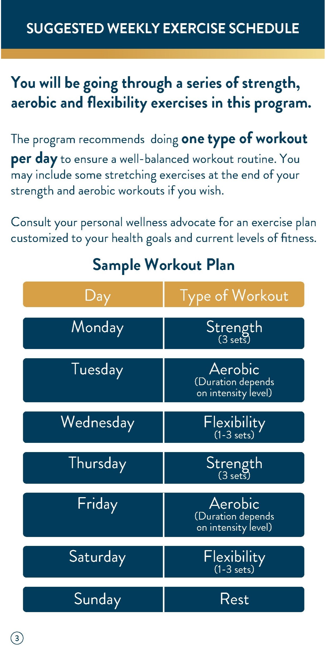 We are all different. The program recommends meal and exercise plans catered to your age, weight, gender and activity levels. Below you can see an example of the type of plan you might get from the program.