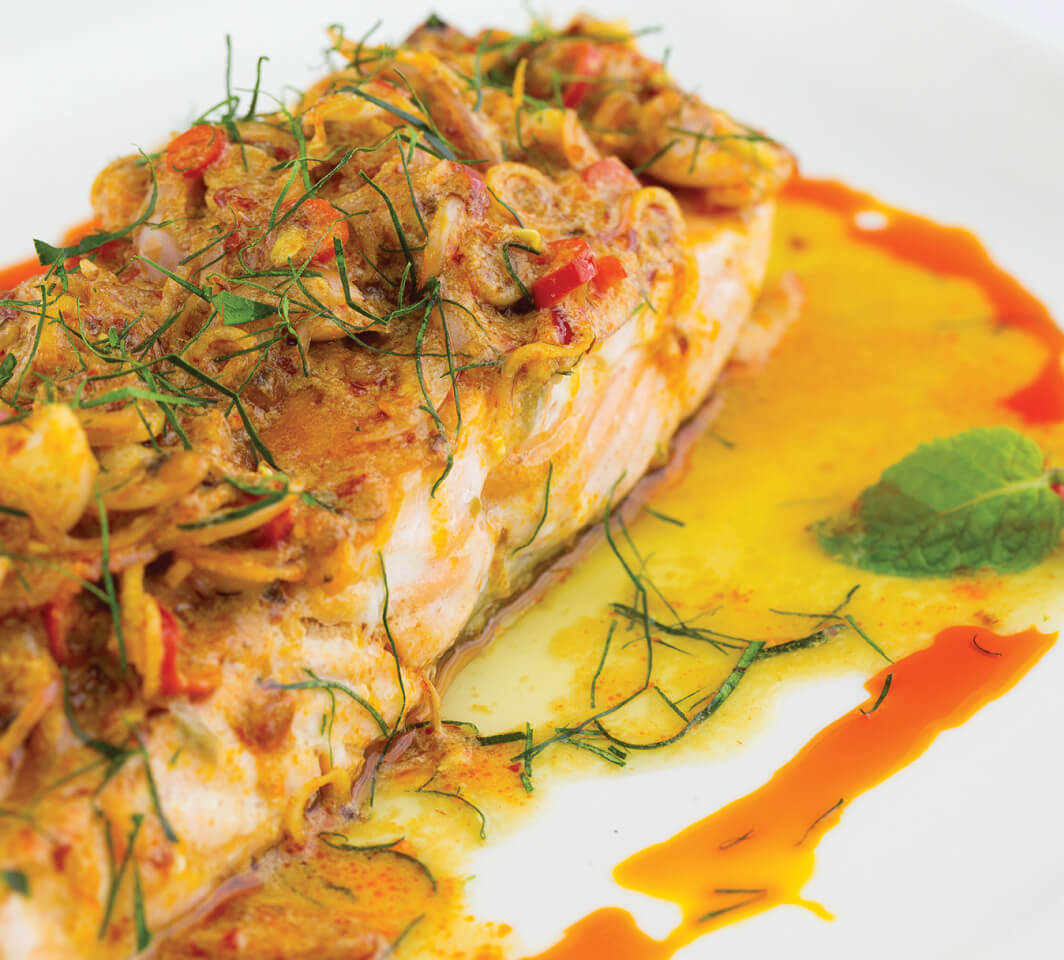 3. ตักน้ำยำราดบนปลาแซลมอน โรยหน้าด้วยพริกขี้หนูและใบสาระแหน่