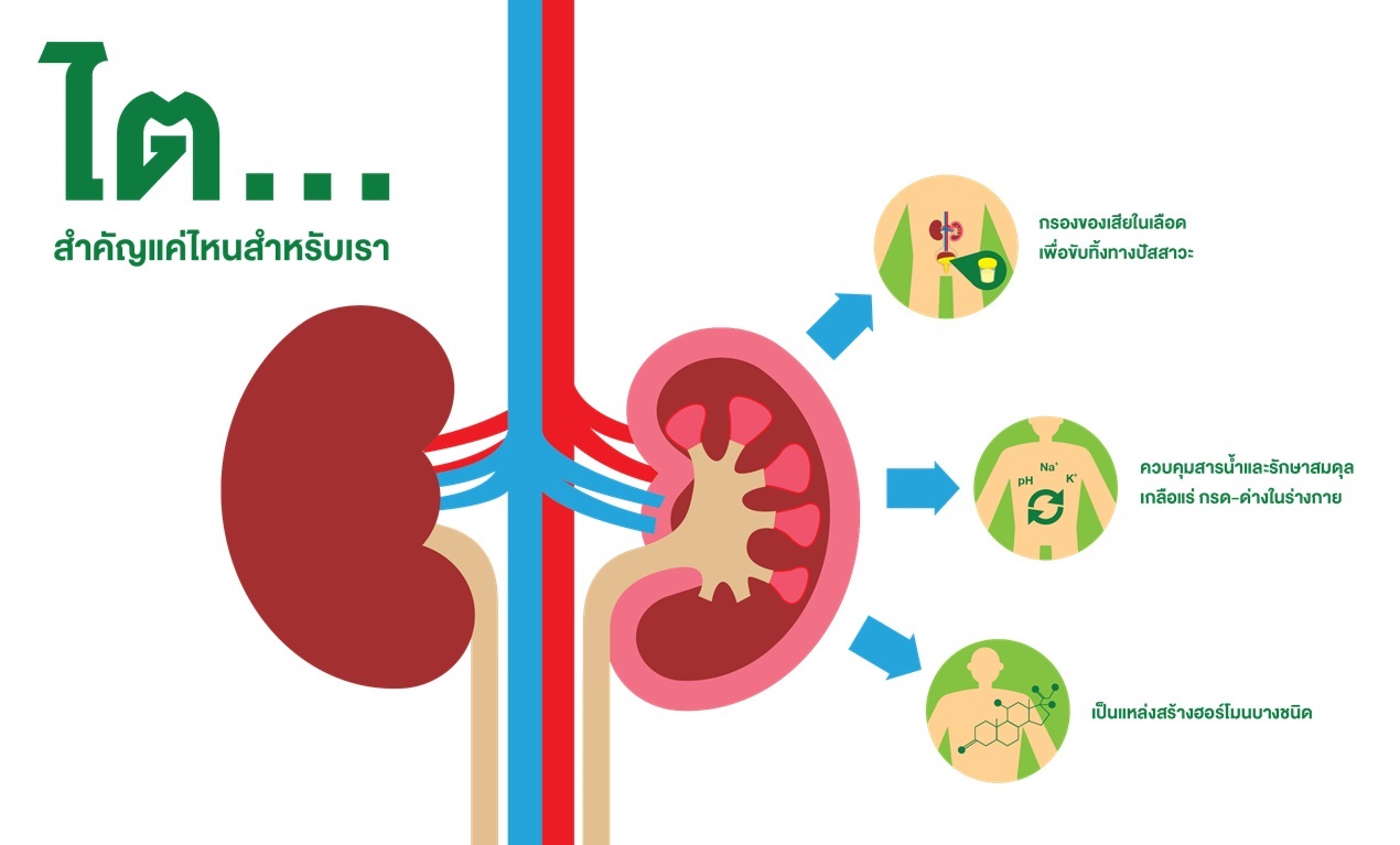จะเห็นว่าไตเป็นมากกว่าแค่กลไกการกรองของเสียออกจากร่างกายตามที่เคยทราบกัน แต่ยังมีหน้าที่สำคัญอื่นๆ ที่สัมพันธ์กับระบบต่างๆ ทั้งความดันโลหิต หัวใจและหลอดเลือด ความสมดุลของน้ำและเกลือแร่ ความสมบูรณ์ของเม็ดเลือด ความสมบูรณ์ของกระดูก ฯลฯ ดังนั้นในคนทั่วไปที่ไตยังปกติดีอยู่ อย่าละเลยการดูแลสุขภาพ ควรใส่ใจถนอมไตให้ปลอดโรคและแข็งแรงตั้งแต่วันนี้ดีที่สุด