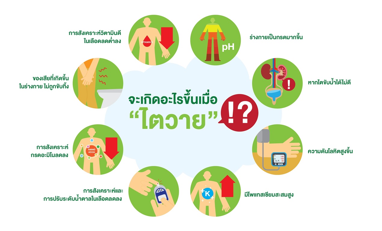 ดังนั้นเมื่อไตเป็นอวัยวะที่ไม่ต่างกับศูนย์กลางสร้างสัมพันธ์ให้ระบบต่างๆ ทำงานได้อย่างราบรื่นเป็นปกติ เมื่อไตเสื่อมสู่ขั้นไตวายร่างกายจึงเสียสมดุลจนทำให้เกิดโรคอื่นๆ ตามมาอีกมากมาย