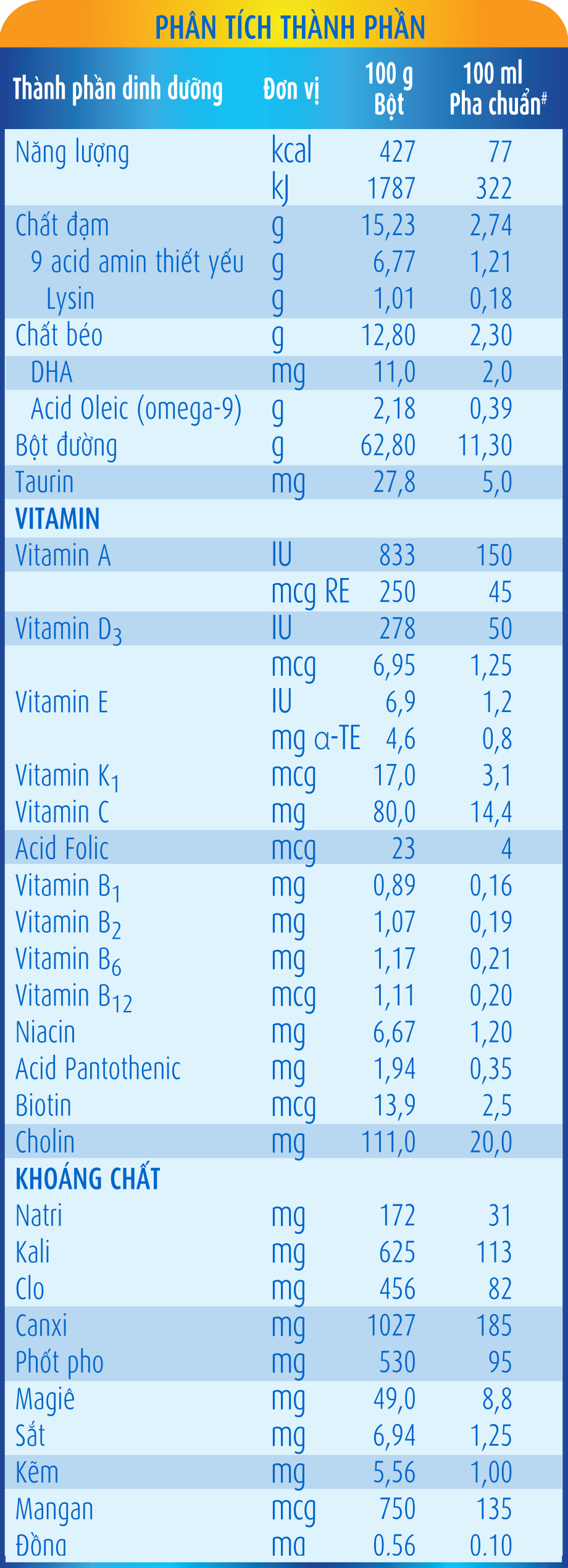 Sữa toàn phần bổ sung lecithin và sữa tách kem, mật bắp, sucrose, lactose, KHOÁNG CHẤT (tricanxi phosphat, sắt sulfat, kẽm sulfat, mangan sulfat, đồng sulfat), VITAMIN (acid ascorbic, cholin bitartrat, vitamin E acetat, niacinamid, vitamin D3, vitamin A acetat, pyridoxin hydroclorid, canxi pantothenat, thiamin hydroclorid, vitamin K1, riboflavin, acid folic, d-biotin), hương vani tổng hợp, dầu cá (nguồn cung cấp DHA), taurin.