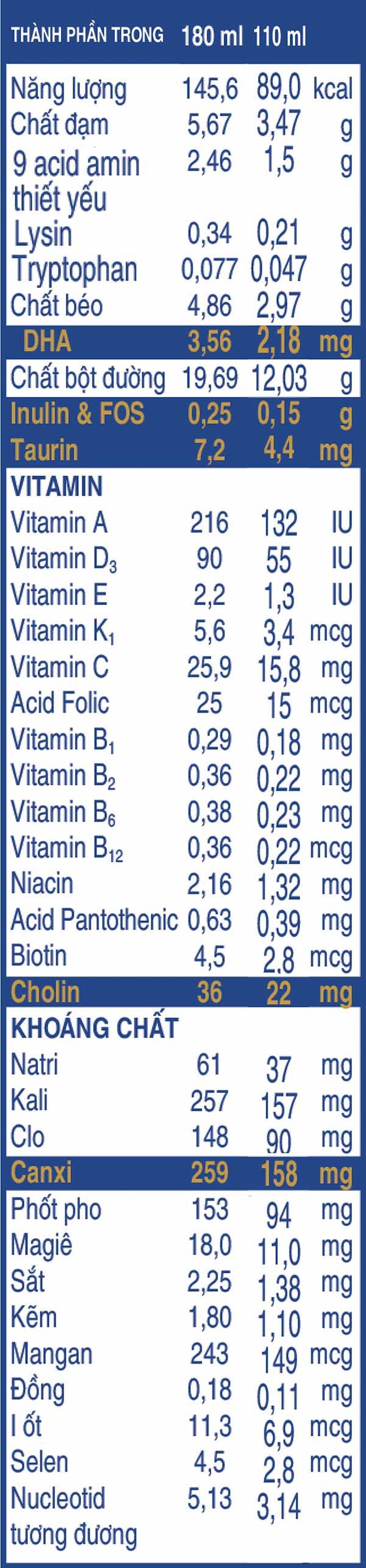 Nước, sữa toàn phần, sucrose, sữa tách kem, lactose, mật bắp, KHOÁNG CHẤT (canxi carbonat, natri hexametaphosphate, kali citrat, sắt sulfat, kẽm sulfat, mangan sulfat, đồng sulfat, natri selenat, kali iodid), hỗn hợp inulin và fructo-oligosaccharid (FOS), VITAMIN (acid ascorbic, cholin bitartrat, vitamin E acetat, niacinamid, vitamin D3, thiamin hydroclorid, vitamin A acetat, pyridoxin hydroclorid, canxi pantothenat, riboflavin, acid folic, vitamin K1, d-biotin, cyanocobalamin), hương liệu vani tổng hợp, chất ổn định gôm cellulose, chất ổn định carrageenan, dầu hướng dương giàu oleic, chất nhũ hóa lecithin đậu nành, chất ổn định gôm gellan, taurin, acid docosahexaenoic (DHA), NUCLEOTID (cytidin 5'-monophosphat, dinatri guanosin 5'-monophosphat, dinatri uridin 5'-monophosphat, adenosin 5'-monophosphat), beta caroten.